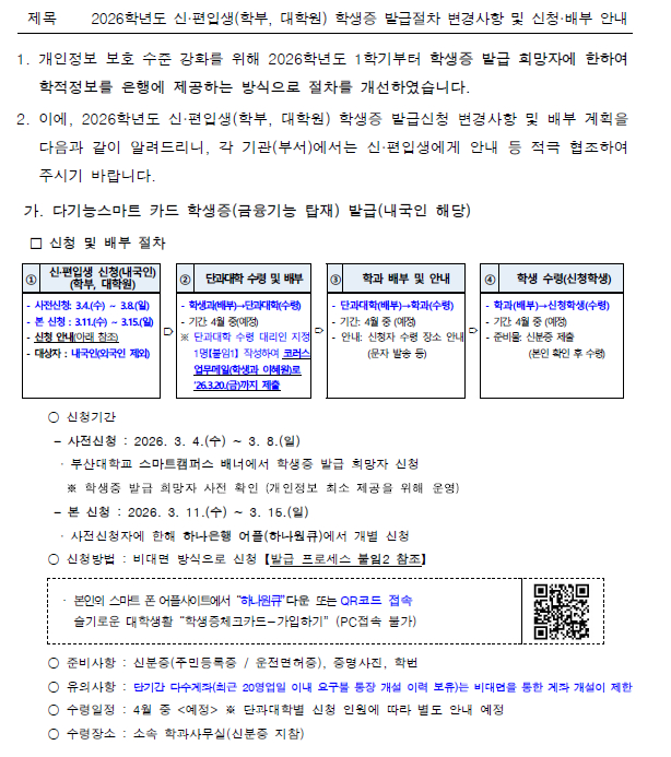 2026학년도 신입생 학생증 발급절차 안내